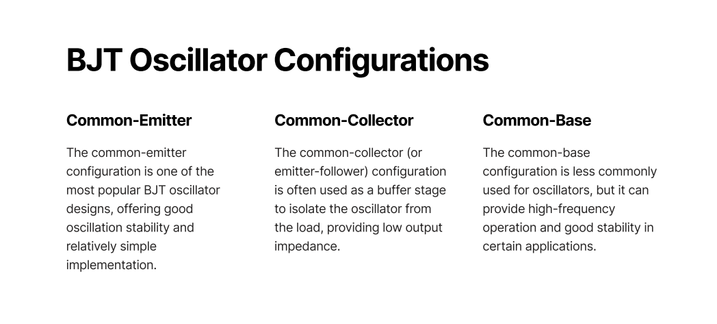 These configurations can be further modified and combined in various ways to achieve specific circuit requirements. The choice of configuration depends on factors such as input/output impedance requirements, gain, frequency response, and linearity needed for the particular application.