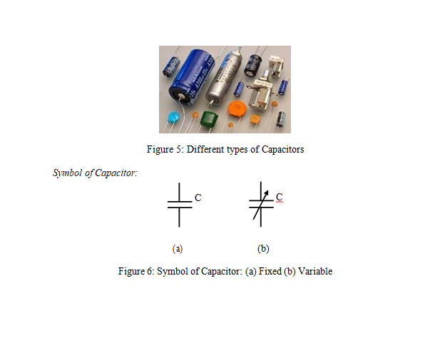 The Capacitor, also known as a Condenser, is also a passive component just like a resistance. It stores its energy in the form of an electrostatic field producing a potential difference (static voltage) across its plates. It consists of two conductive plates which are not connected but are electrically separated by an insulating material known as dielectric. In simple terms, a capacitor stores electrical energy and releases it whenever required. Like resistors, capacitors are also fixed or variable type. Fixed type capacitors are mica, ceramic, paper and electrolytic. Variable type mostly include air-gang capacitors. The different types of capacitor are shown in Fig. 5