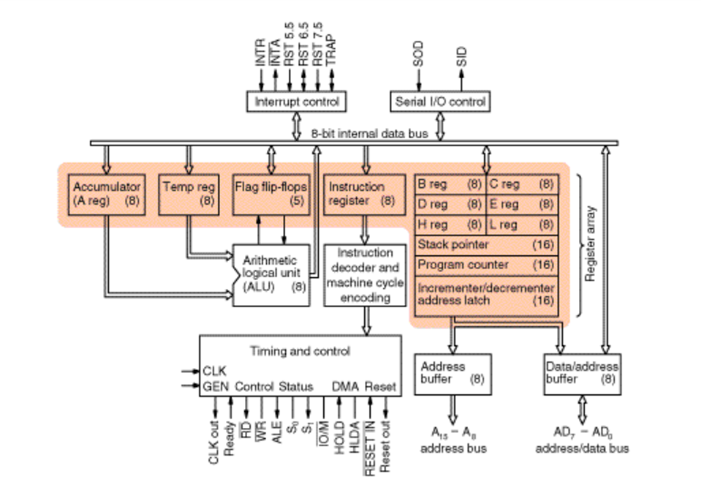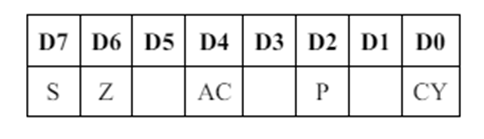 Flags: The ALU includes five flip-flops, which are set or reset after an operation according to data conditions of the result in the accumulator and other registers. They are called Zero(Z), Carry (CY), Sign (S), Parity (P), and Auxiliary Carry (AC) flags; they are listed in the Table and their bit positions in the flag register are shown in the Figure below. The most commonly used flags are Zero, Carry, and Sign. The microprocessor uses these flags to test data conditions. For example, after an addition of two numbers, if the sum in the accumulator id larger than eight bits, the flip-flop uses to indicate a carry – – called the Carry flag (CY) – is set to one. When an arithmetic operation results in zero, the flip-flop called the Zero(Z) flag is set to one. The first Figure shows an 8-bit register, called the flag register, adjacent to the accumulator. However, it is not used as a register; five bit positions out of eight are used to store the outputs of the five flip-flops. The flags are stored in the 8-bit register so that the programmer can examine these flags (data conditions) by accessing the register through an instruction These flags have critical importance in the decision-making process of the microprocessor. The conditions (set or reset) of the flags are tested through the software instructions. For example, the instruction JC (Jump on Carry) is implemented to change the sequence of a program when CY flag is set. The thorough understanding of flag is essential in writing assembly language programs.