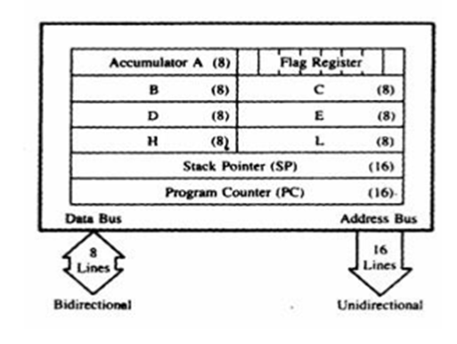 Registers: The 8085/8080A-programming model includes six registers, one accumulator, and one flag register, as shown in Figure. In addition, it has two 16-bit registers: the stack pointer and the program counter. They are described briefly as follows. The 8085/8080A has six general-purpose registers to store 8-bit data; these are identified as B, C, D, E, H, and L as shown in the figure. They can be combined as register pairs – BC, DE, and HL – to perform some 16-bit operations. These pairs are referred to as the extended registers. The programmer can use these registers to store or copy data into the registers by using data copy instructions.