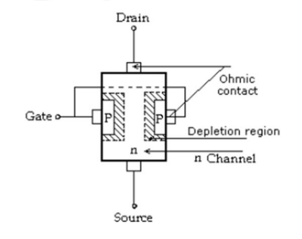 The basic construction of n-channel FET is as shown in figure. The major part of JEET is the channel between embedded P types of material. The top of the n-channel is connected to an ohmic contact called as ‘Drain’ (D) & lower end of Channel is called as ‘Source’ (S). The two p types of materials are connected together & to the ‘Gate’ terminal (G).