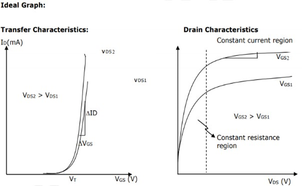 - Plot the output characteristics VDS versus ID and transfer characteristics VGS versus ID.