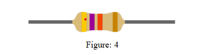 Let’s have a look on the colour coding table: The first and second bands as shown in Fig.4 are yellow and violet corresponding to numbers 4 and 7 respectively. The third band orange is the multiplier i.e. 103. The fourth band which is gold shows the tolerance of ± 5%. So, the value of the resistor is 47×103 ± 5% or 47KΩ ± 5%