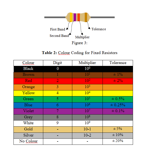 Value of a Resistance: The first and second bands represent the first and second significant digits. The third band is the multiplier i.e. the number of zeroes. The fourth band shows the manufacturer’s tolerance. The representation of four band scheme is explained in Fig. 3. The numerical values related with the colour for fixed resistors is shown in Table 2.